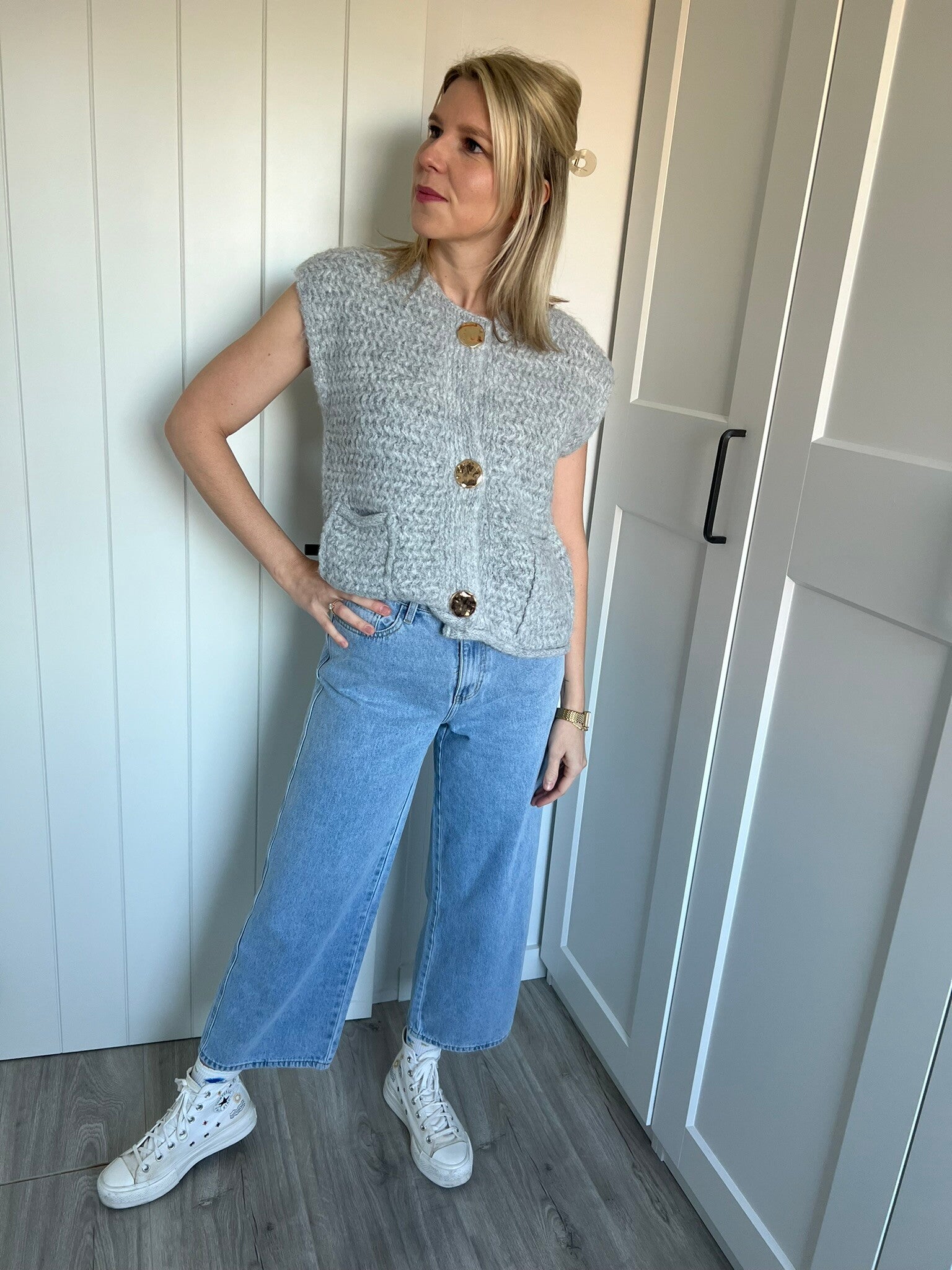 De denim is beschikbaar van maat 34 t.e.m. 42 en valt op maat. Julie draagt maat 36 en meet 1m72.