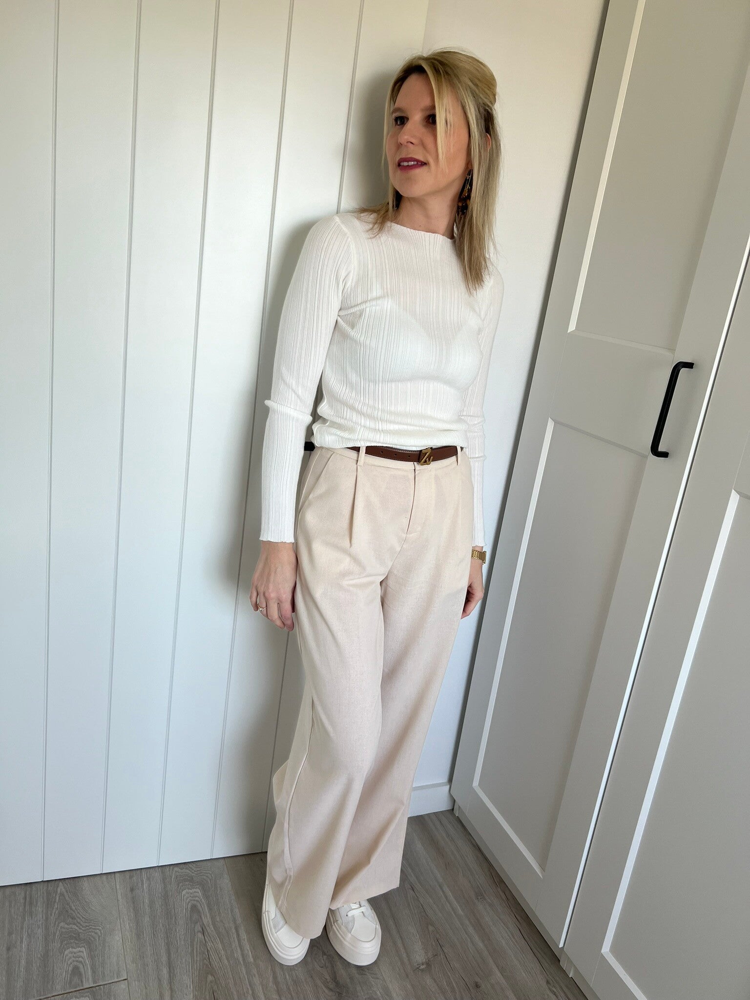 De broek is beschikbaar in maat XS, S, M & L en tailleert op maat. Julie draagt maat S en meet 1m72.