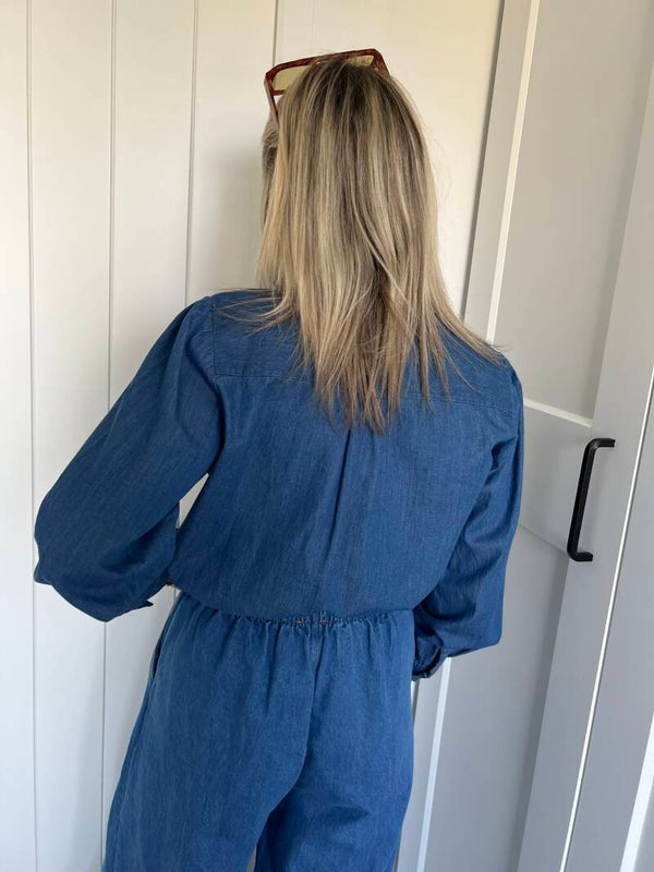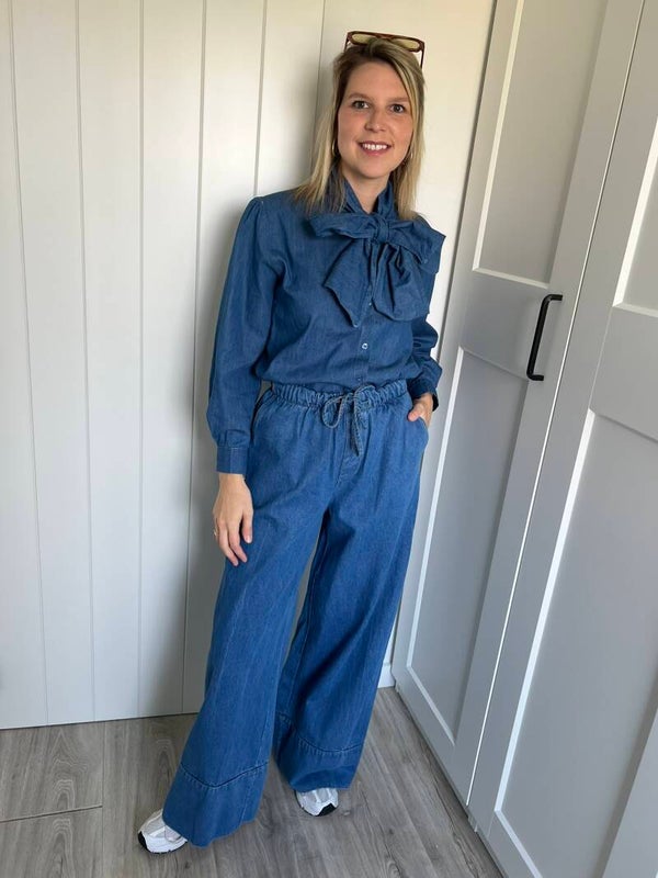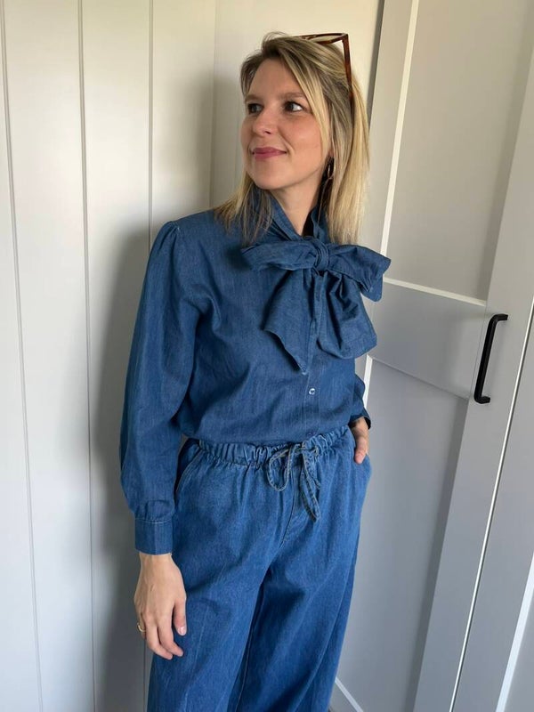 Zeer mooie denim blouse met knoopsluiting & strik aan de hals. De blouse kan zowel sportief op een toffe broek als gekleed op een rok worden gedragen.