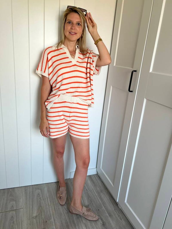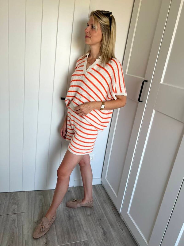 Superleuk beige/oranje set in crochet. De set bestaat uit een shirt en een shortje. De set is zó comfortable.