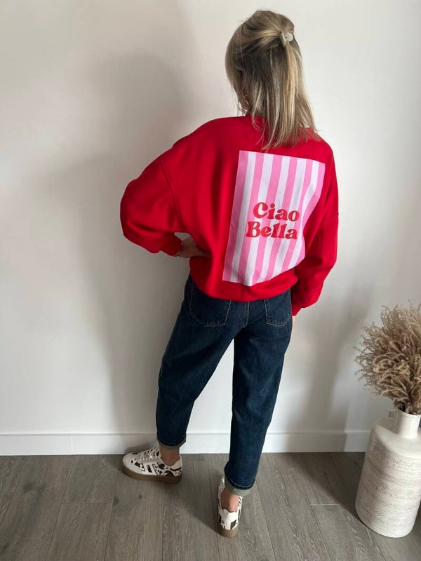 Prachtige rode sweater met mooie opdruk op de achterkant! De sweater is vanbinnen volledig gevoerd met teddystof.