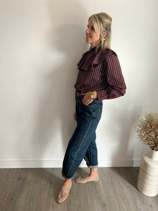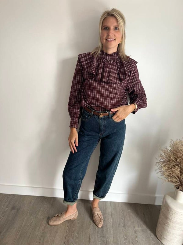 Hoe mooi is deze bordeaux geruite blouse?! De blouse heeft een opstaand kraagje en mooi kraag over de schouders.