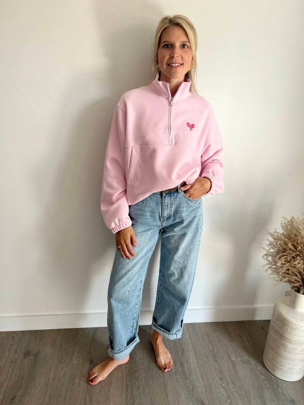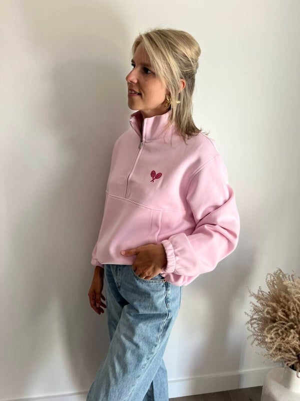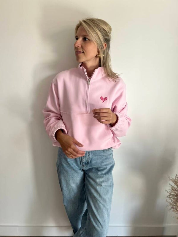 Prachtige roze sweater met geborduurde tennisrackets aan de voorkant! De sweater heeft een korte ritssluiting bovenaan & kan onderaan met rekkertjes worden aangespannen.
