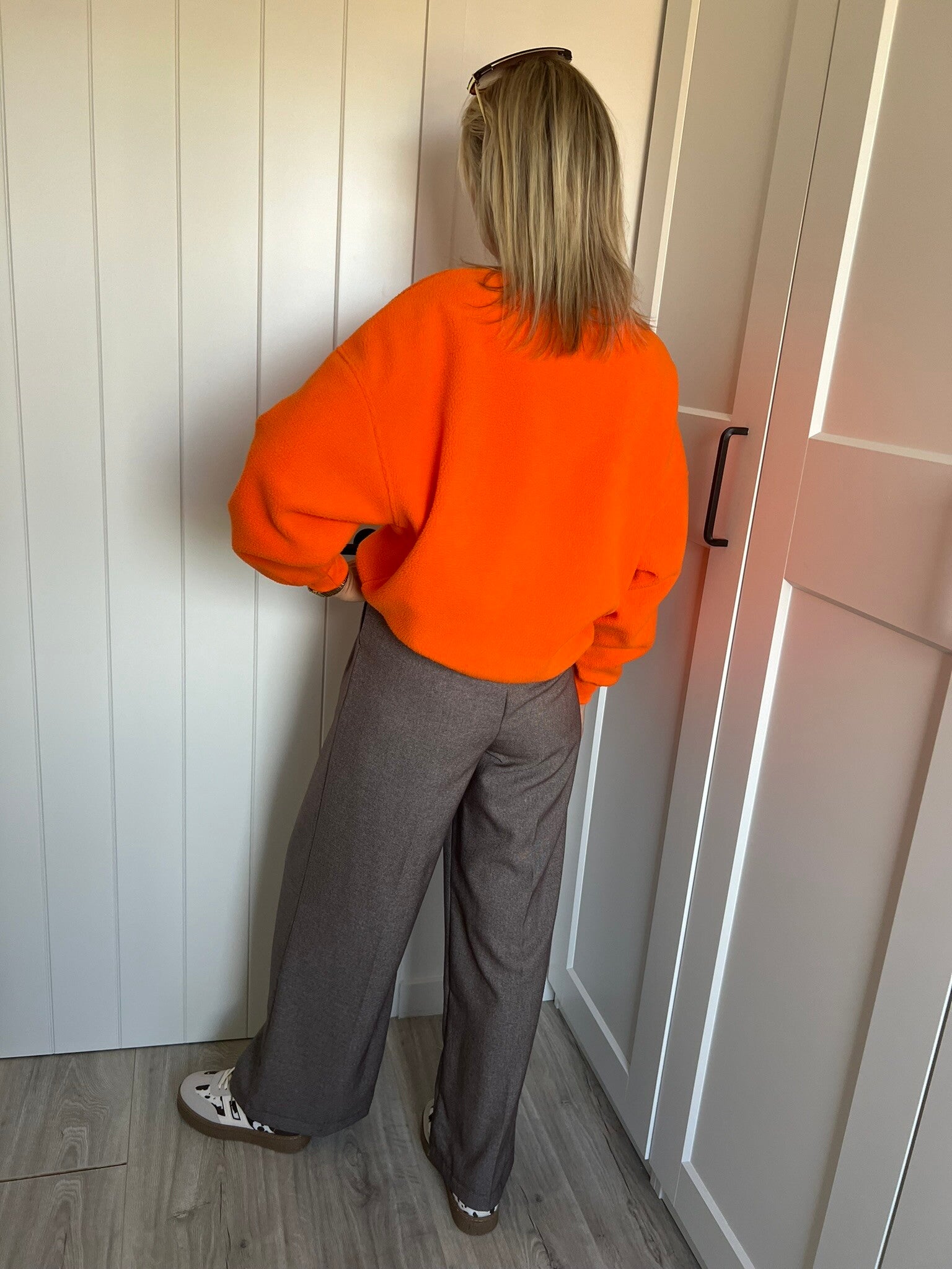 De broek is beschikbaar in maat S, M & L en valt op maat. Julie draagt maat S en meet 1m72.