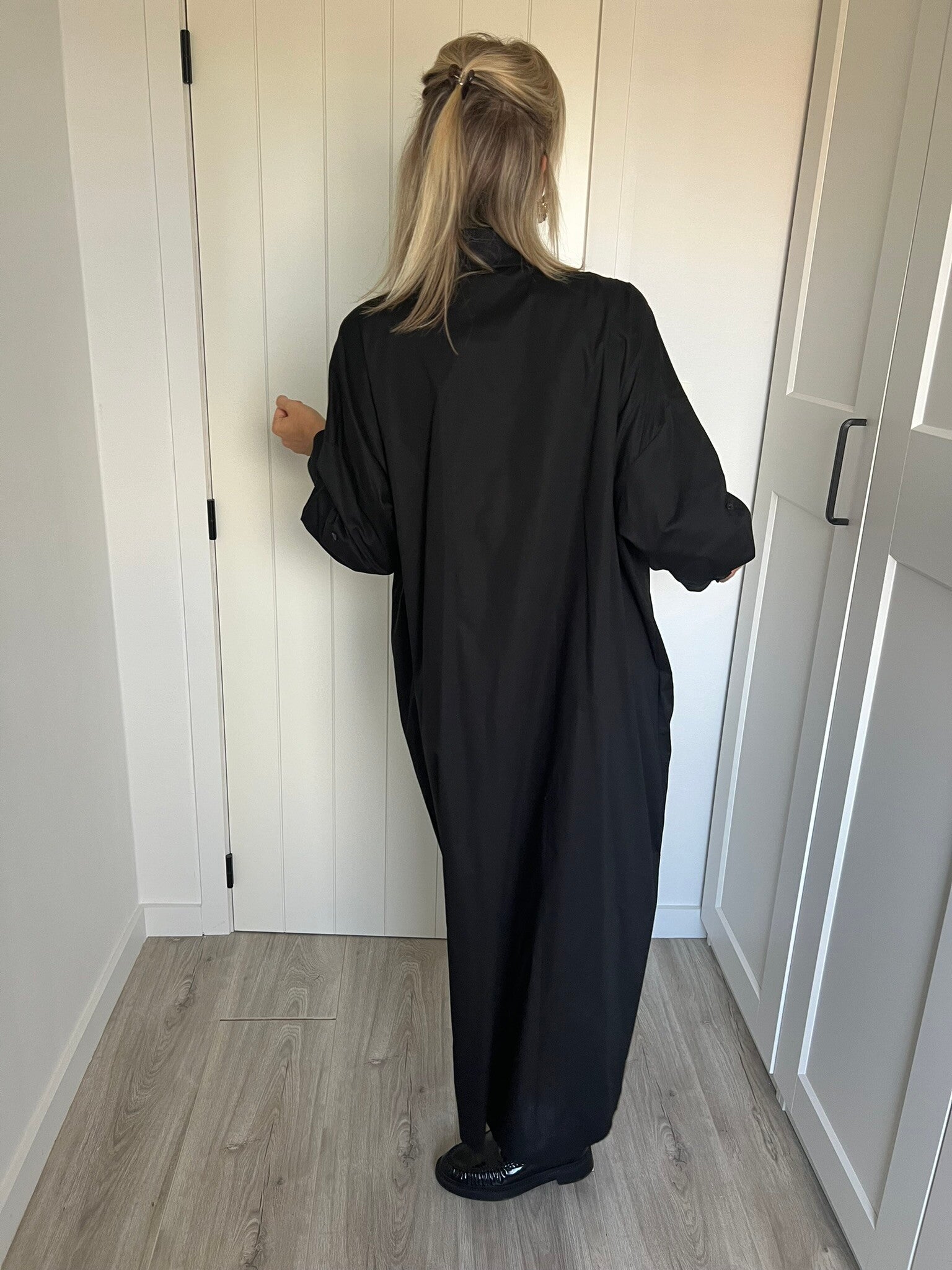 De jurk is beschikbaar in maat TU en past tot XL (valt oversized!). Julie draagt maat TU en meet 1m72.