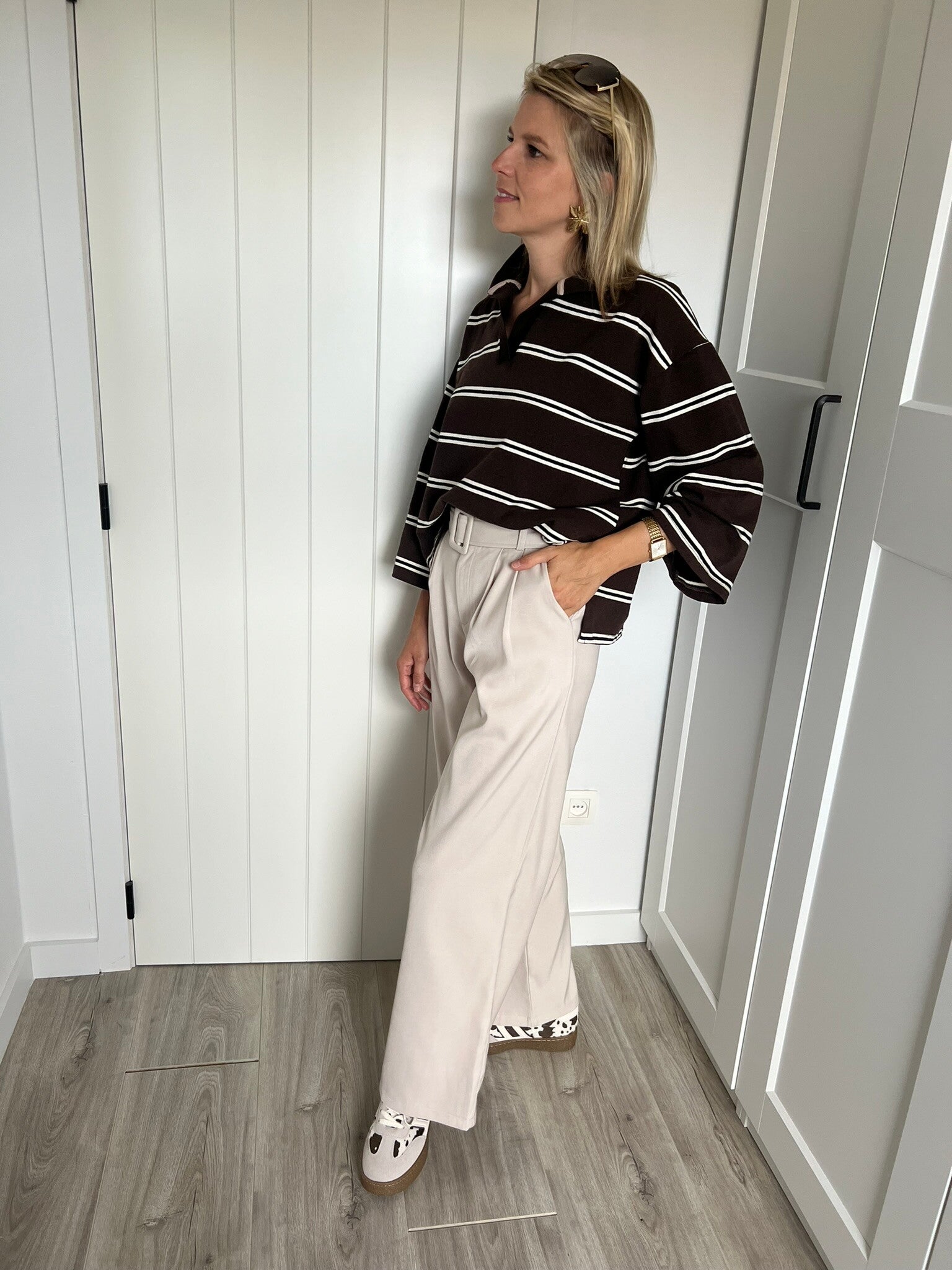 De broek is beschikbaar van maat XS t.e.m. L en valt groot. Twijfel je tussen twee maten? Dan zou ik opteren voor de kleinste maat! Julie draagt maat XS en meet 1m72.