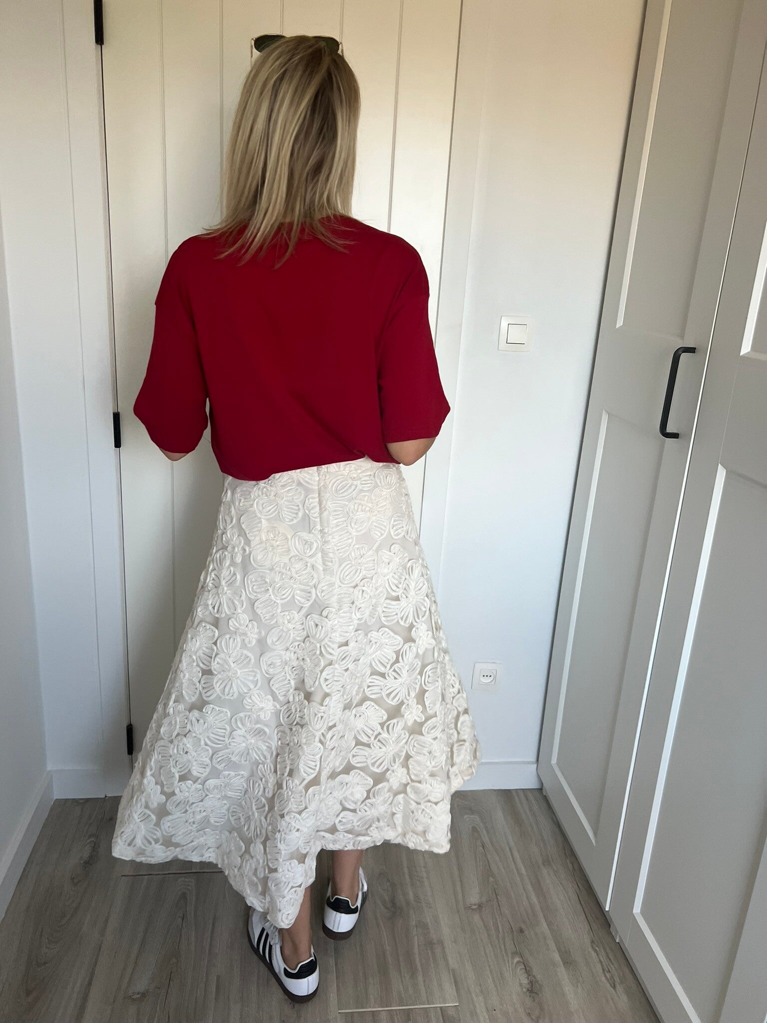 De shirt is beschikbaar in maat S, M & L en valt op maat tot ruim. Julie draagt maat S en meet 1m72.