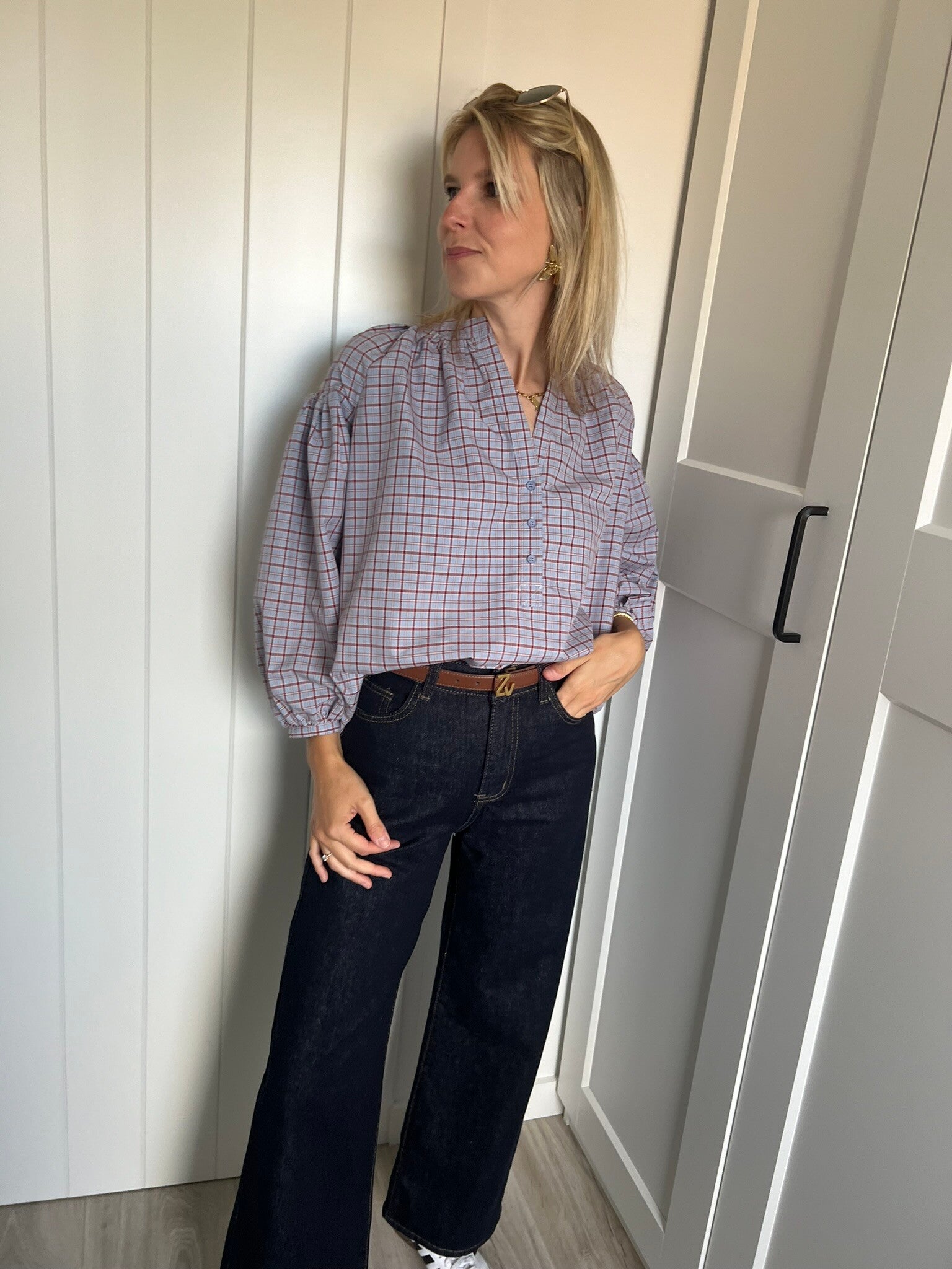 Prachtige geruit blauwe blouse! De blouse heeft een mooie snit met een mooie décolleté.