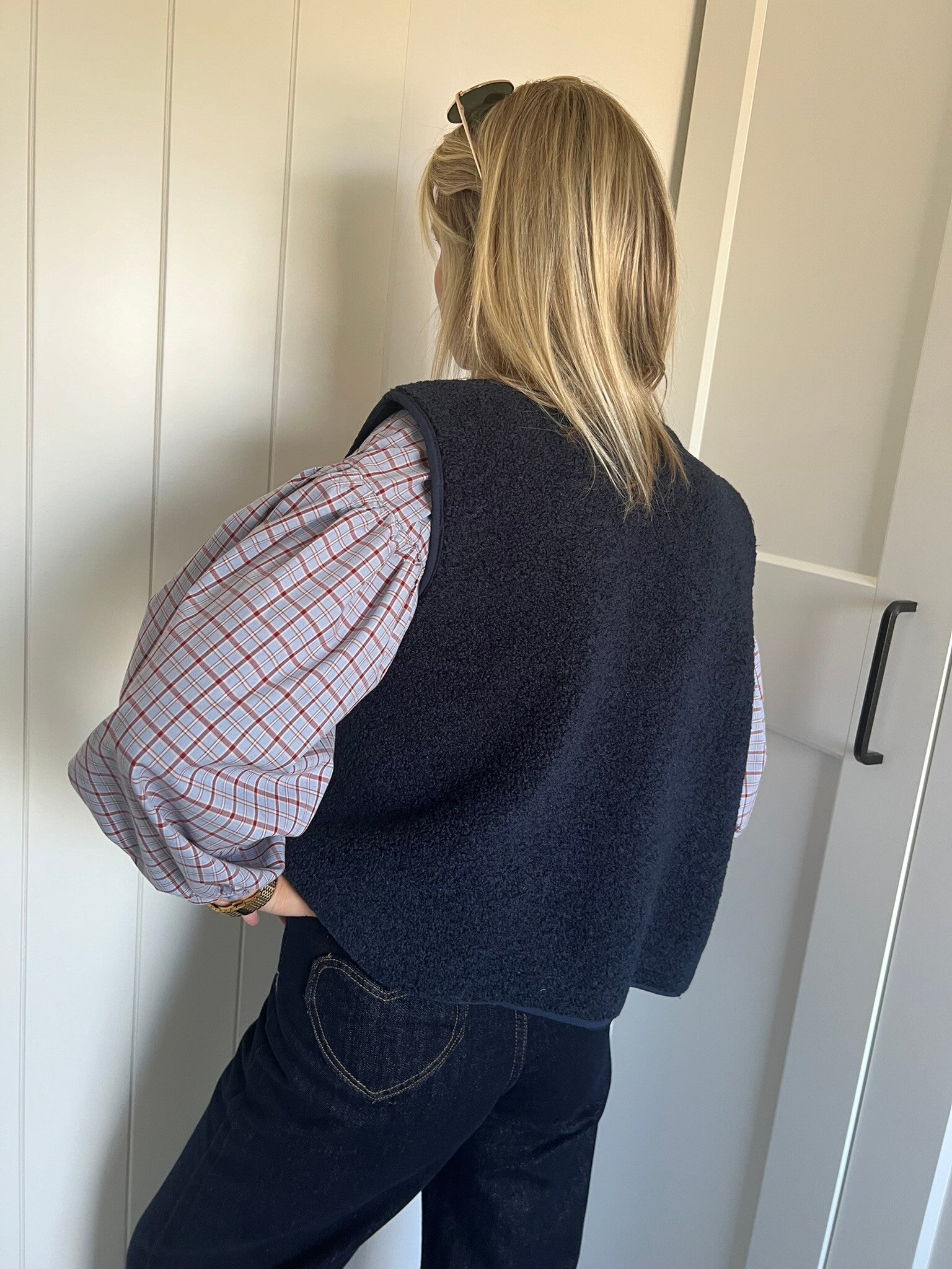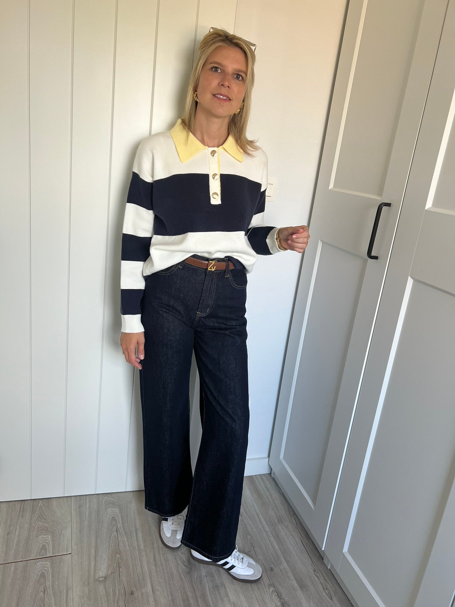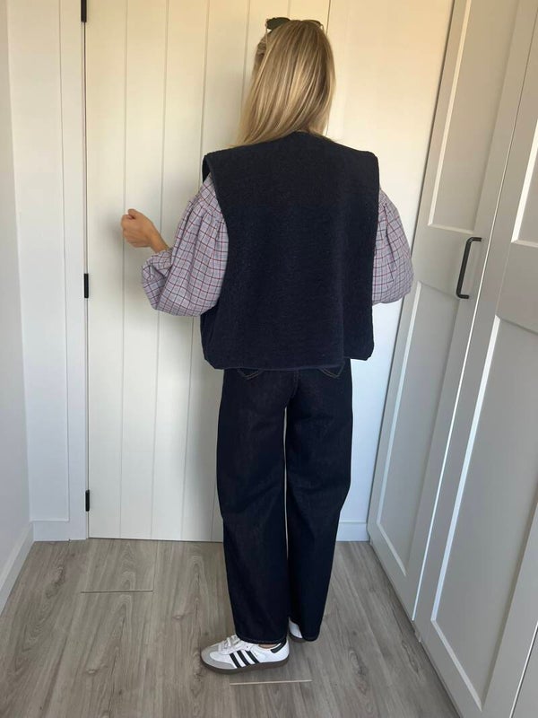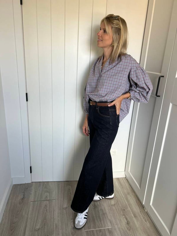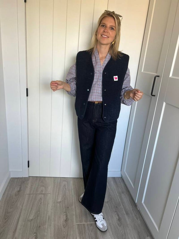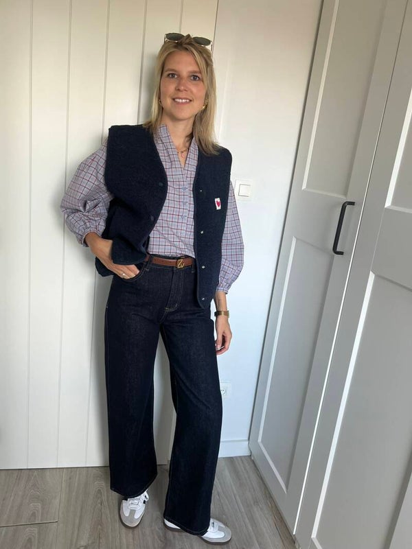 De denim is beschikbaar in maat S, M & L en valt op maat. Julie draagt maat S en meet 1m72.