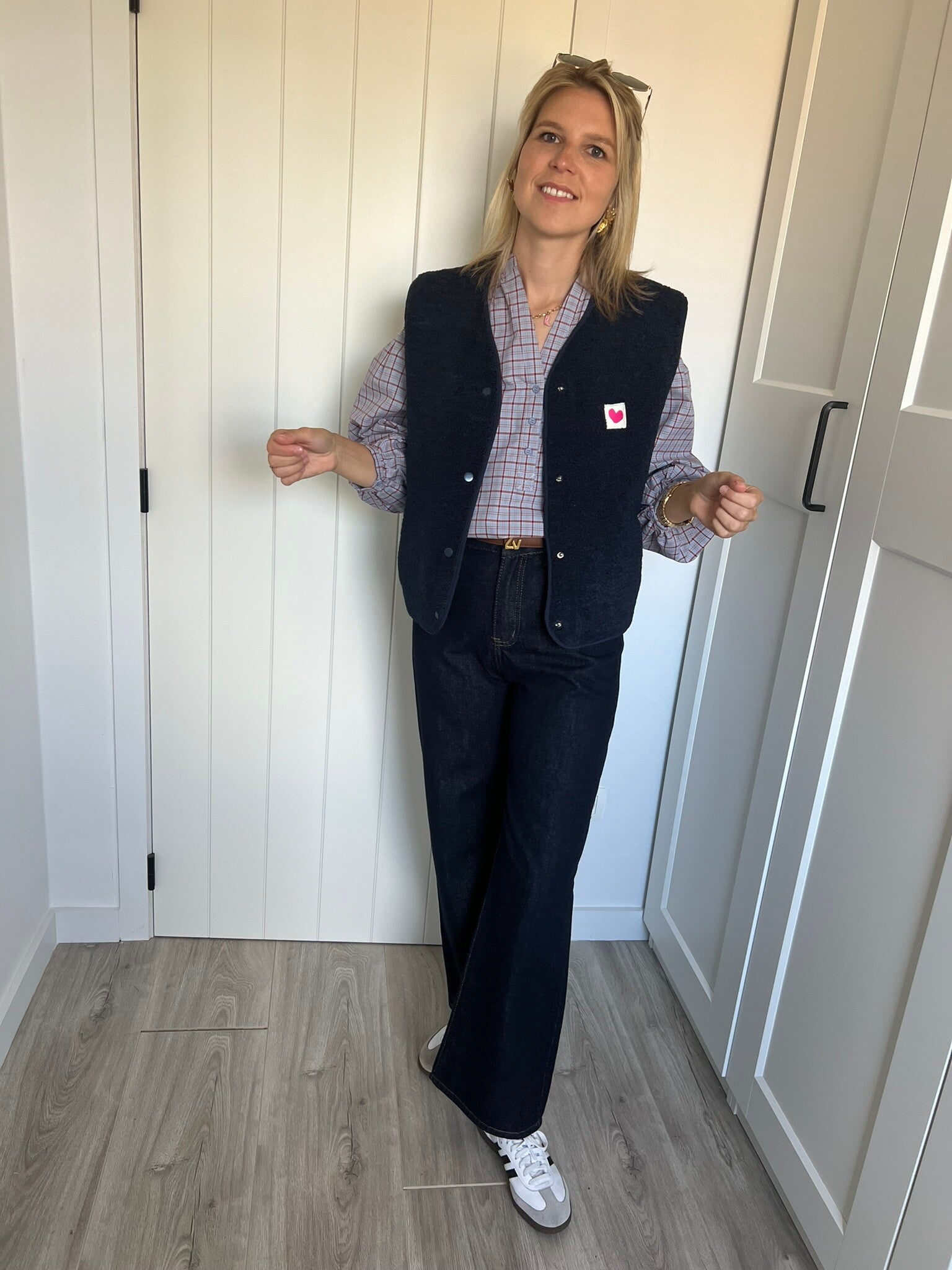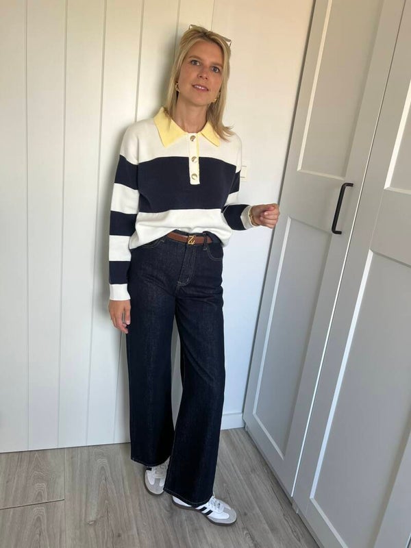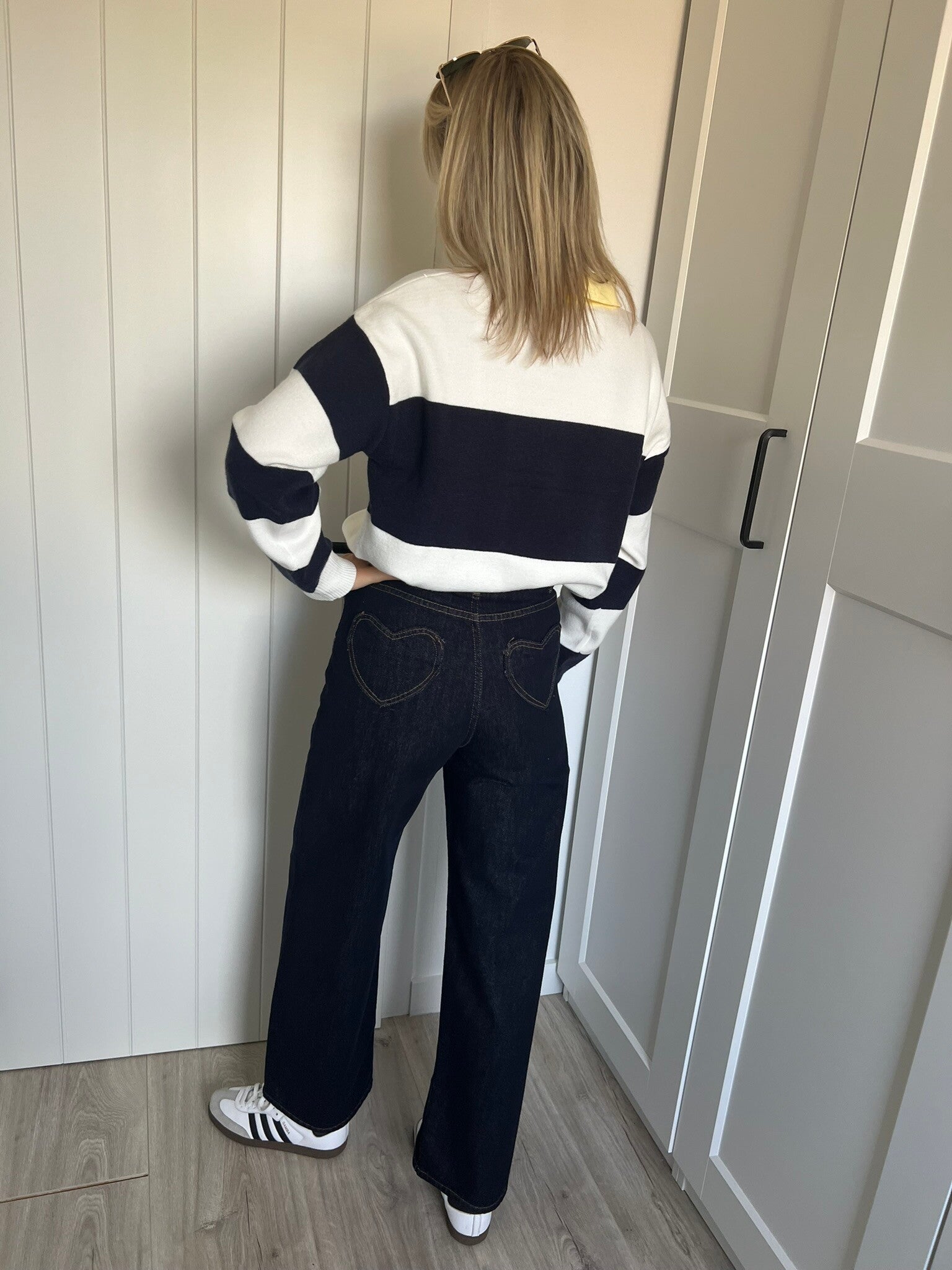 Supermooi donkerblauwe wijde denim! De denim heeft achterzakjes in hartjesvorm, supercute.