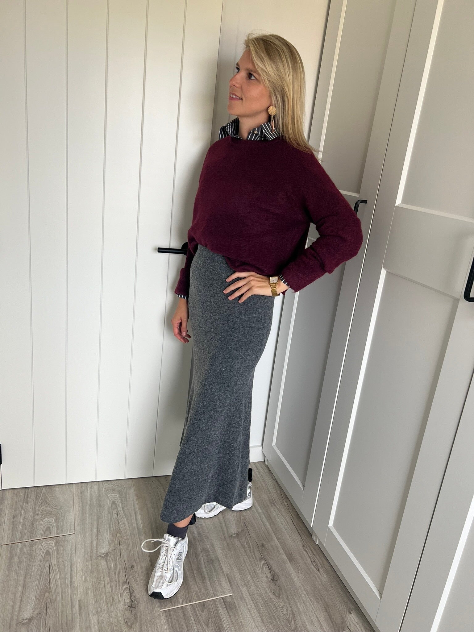 De rok is beschikbaar in maat TU en past tot L/XL. Julie draagt maat TU en meet 1m72.