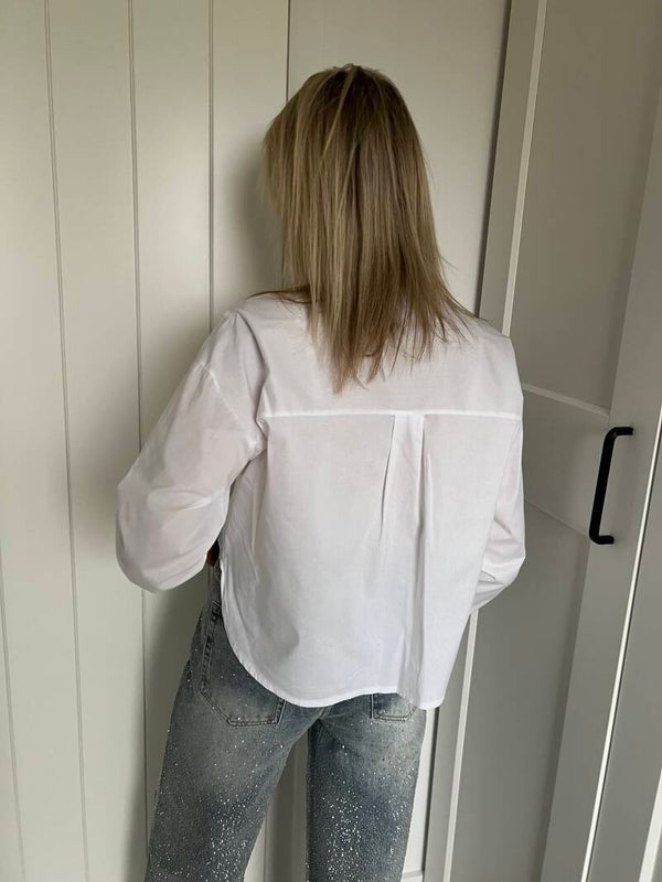 White! ♡Effen witte blouse met een klassiek kraagje. Samenstelling:100 % katoenFit:De blouse is beschikbaar in maat TU en past tot L/XL. Julie draagt maat TU en meet 1m72.