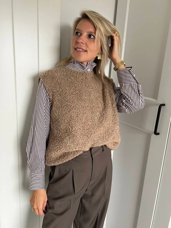 Bruin gestreepte blouse met opstaand kraagje & knoopsluiting. Prachtige pasfit!