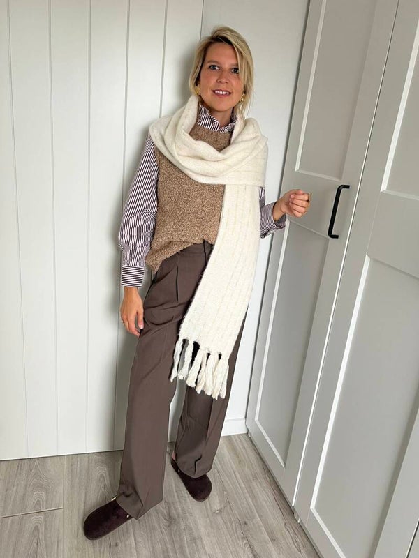 Superzachte ecru sjaal met franjes. De sjaalt prikt