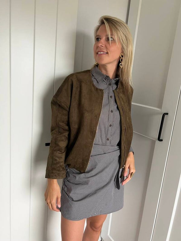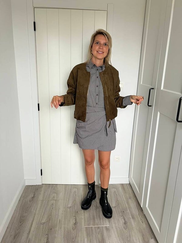 Prachtig kaki suède jasje zonder kraagje - perfect om te combineren met een blouse of een rolcolletje.