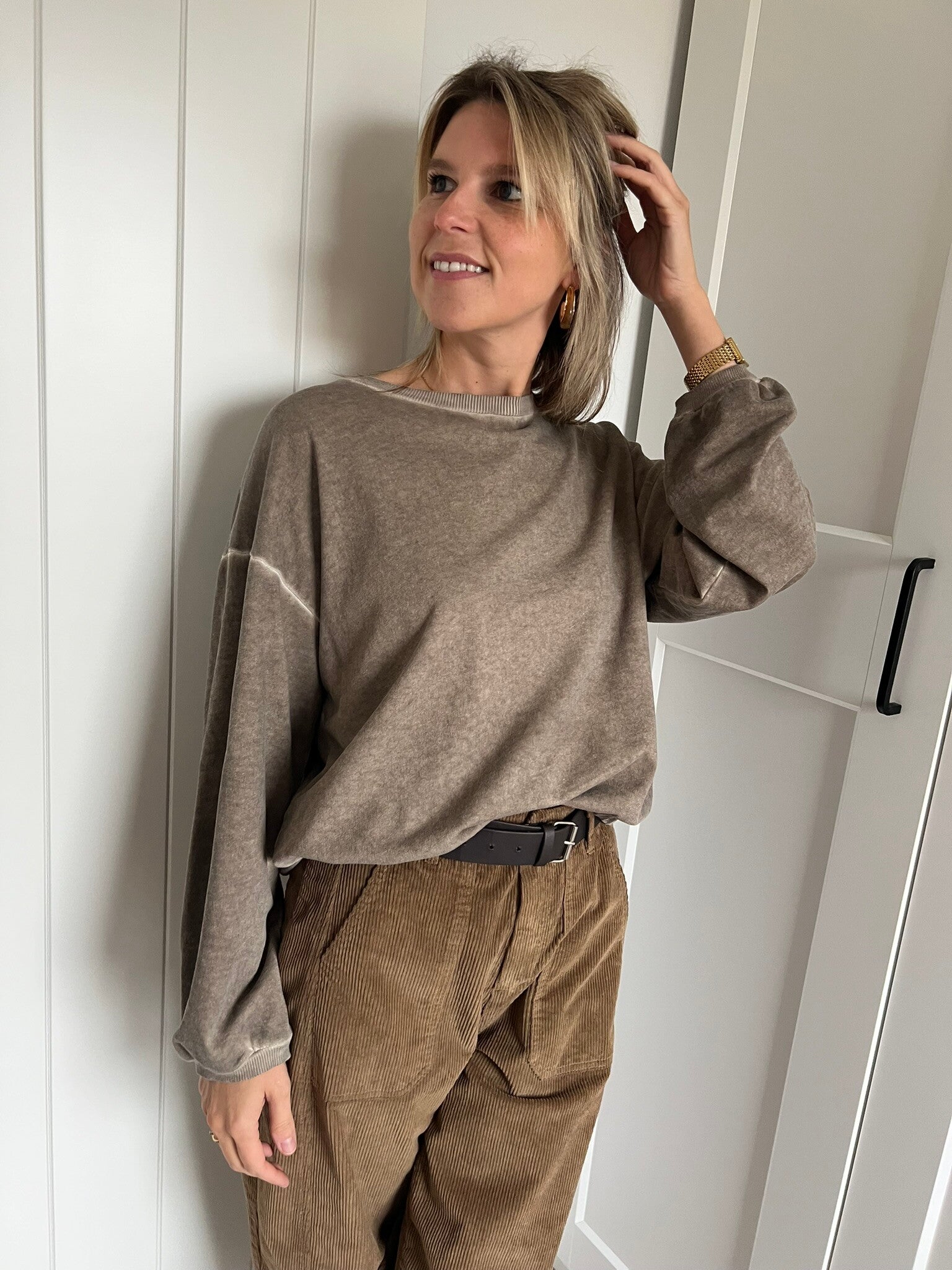 Supermooie lichtbruine sweater met een rekker onderaan voor een pofeffect. De sweater heeft een wijdere hals. Ook superleuk in combinatie met een coltruitje eronder.