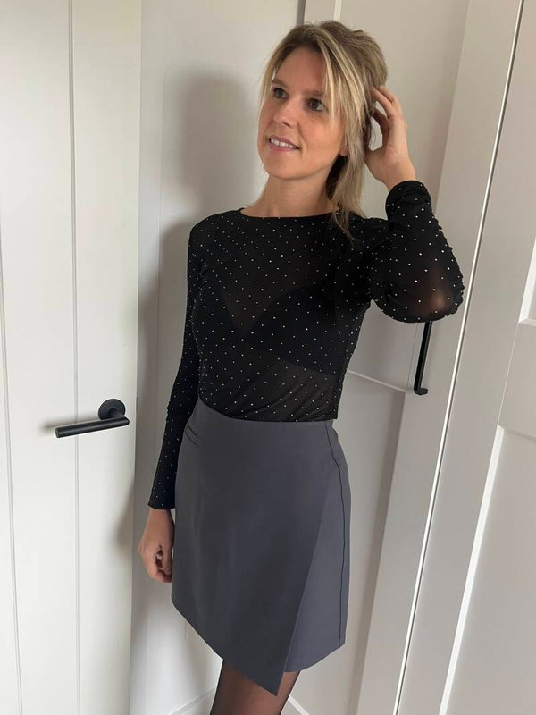 Klassevol grijs rokje met mooi detail vooraan. Absoluut pluspunt: er zit een shortje in het rokje!