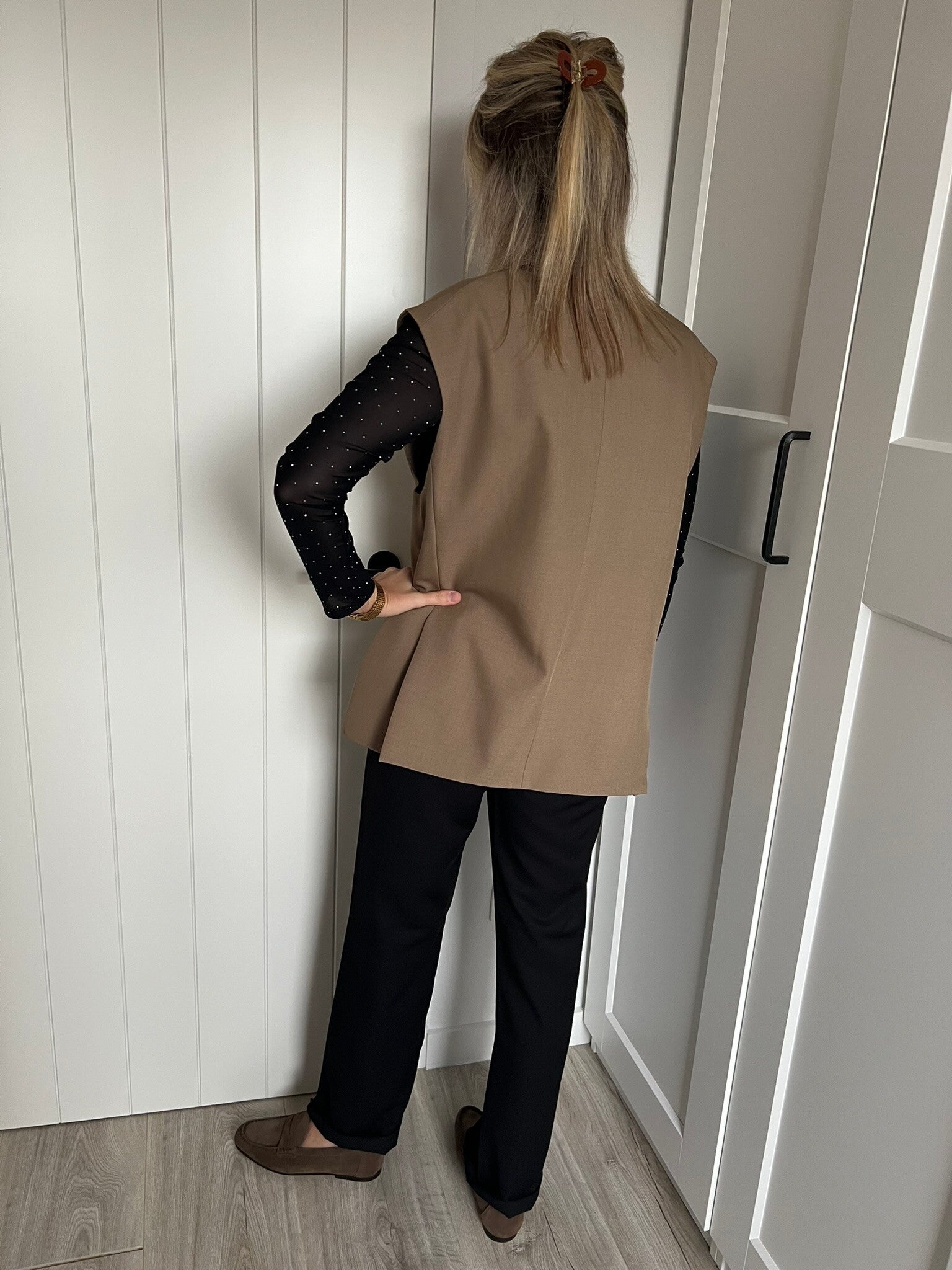De blazer is beschikbaar in maat TU en past tot L/XL. Julie draagt maat TU en meet 1m72.