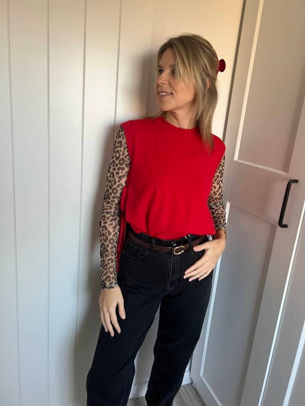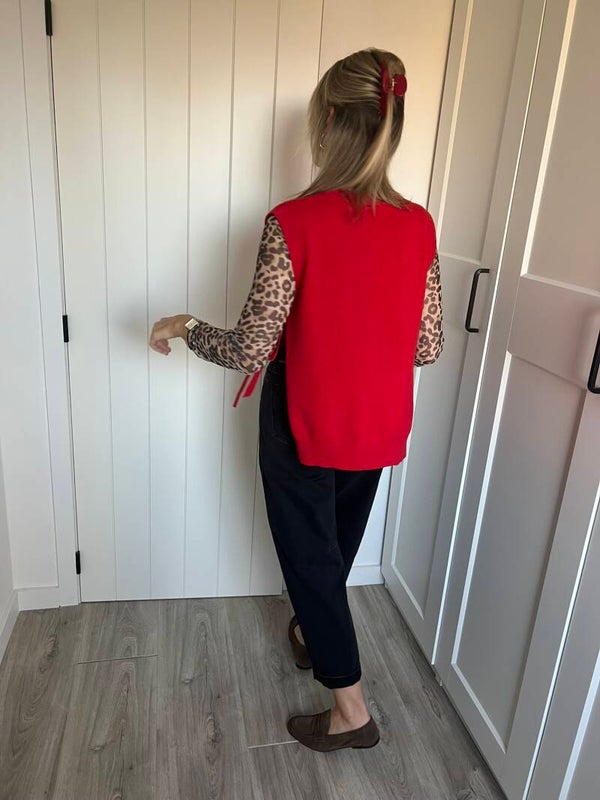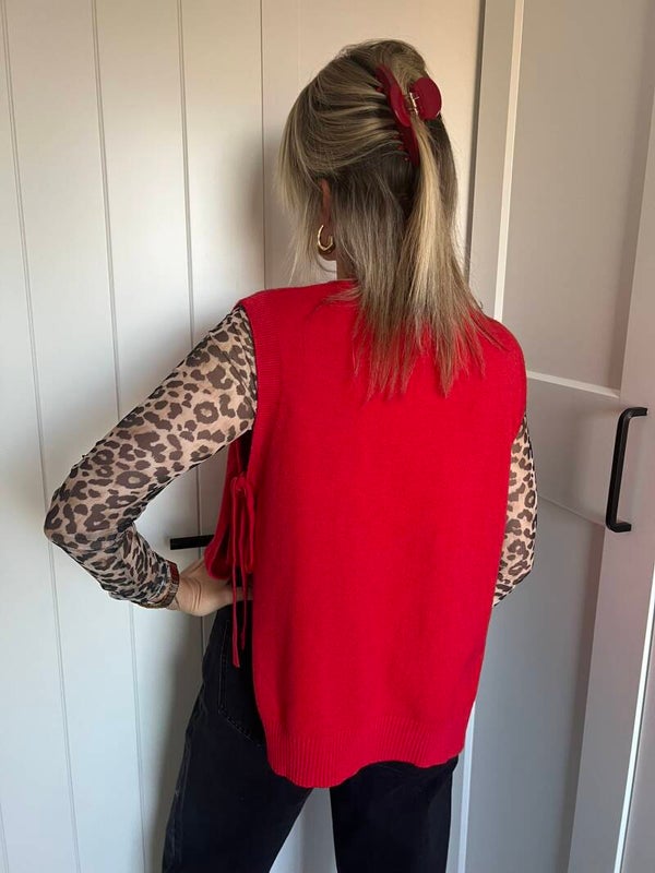 Superzacht rode debardeur met lintjes aan beide zijden. De debardeur kan op een shirt of op een blouse worden gedragen.