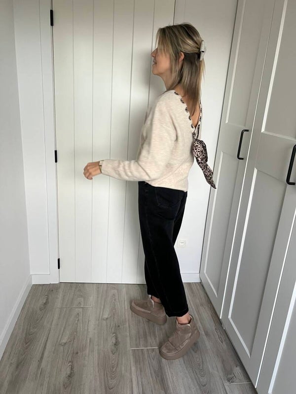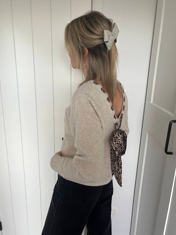 Prachtige beige knit met leopard details aan de hals en strik op de rug. De trui kan langs beide kanten worden gedragen. Superzacht & prikt niet!
