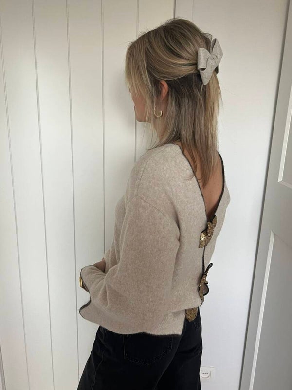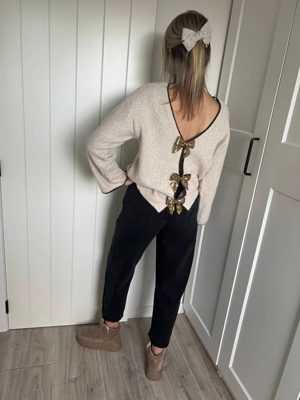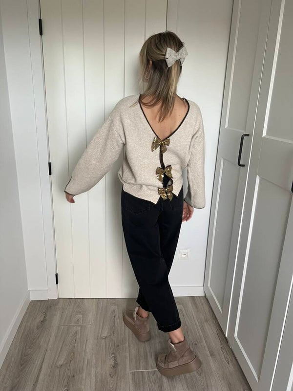 Prachtige beige knit met glitter strikjes. De trui kan langs beide kanten worden gedragen. Superzacht & prikt niet!