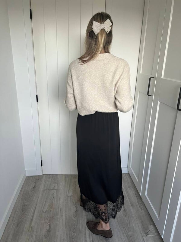 De knit is beschikbaar in maat TU en past tot L/XL. Julie draagt maat TU en meet 1m72.