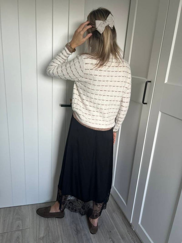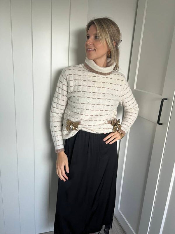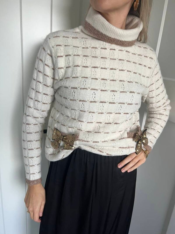 Prachtige beige gestreepte coltrui met twee glitterstrikjes vooraan. De trui is superzacht & prikt niet!