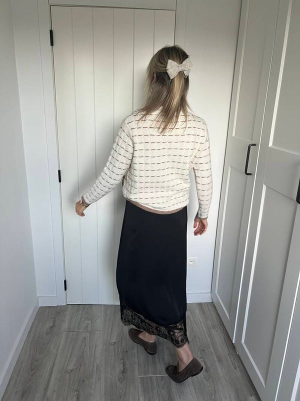 De knit is beschikbaar in maat TU en past tot L/XL. Julie draagt maat TU en meet 1m72.