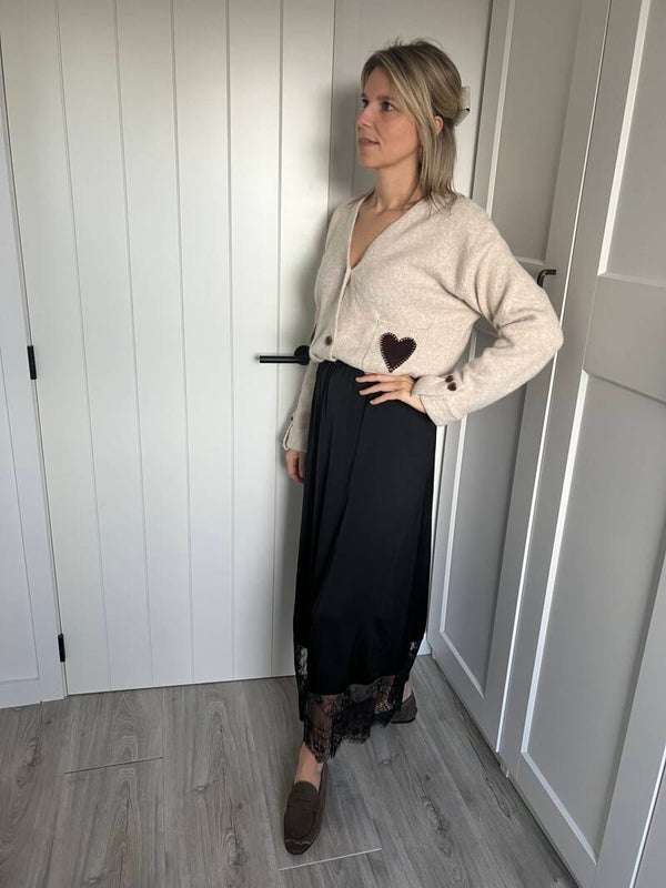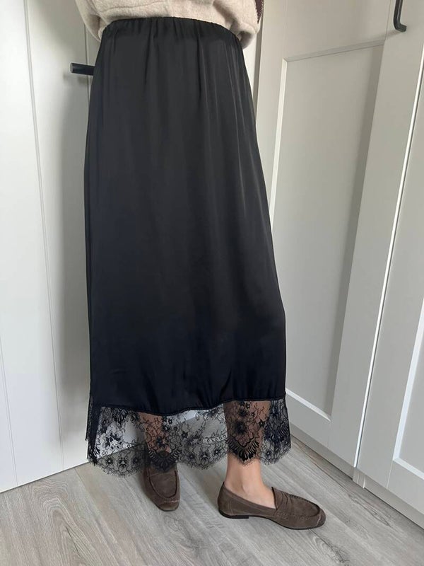 Prachtige zwarte satijnen rok met kant onderaan. De rok heeft een rekker in de taille.