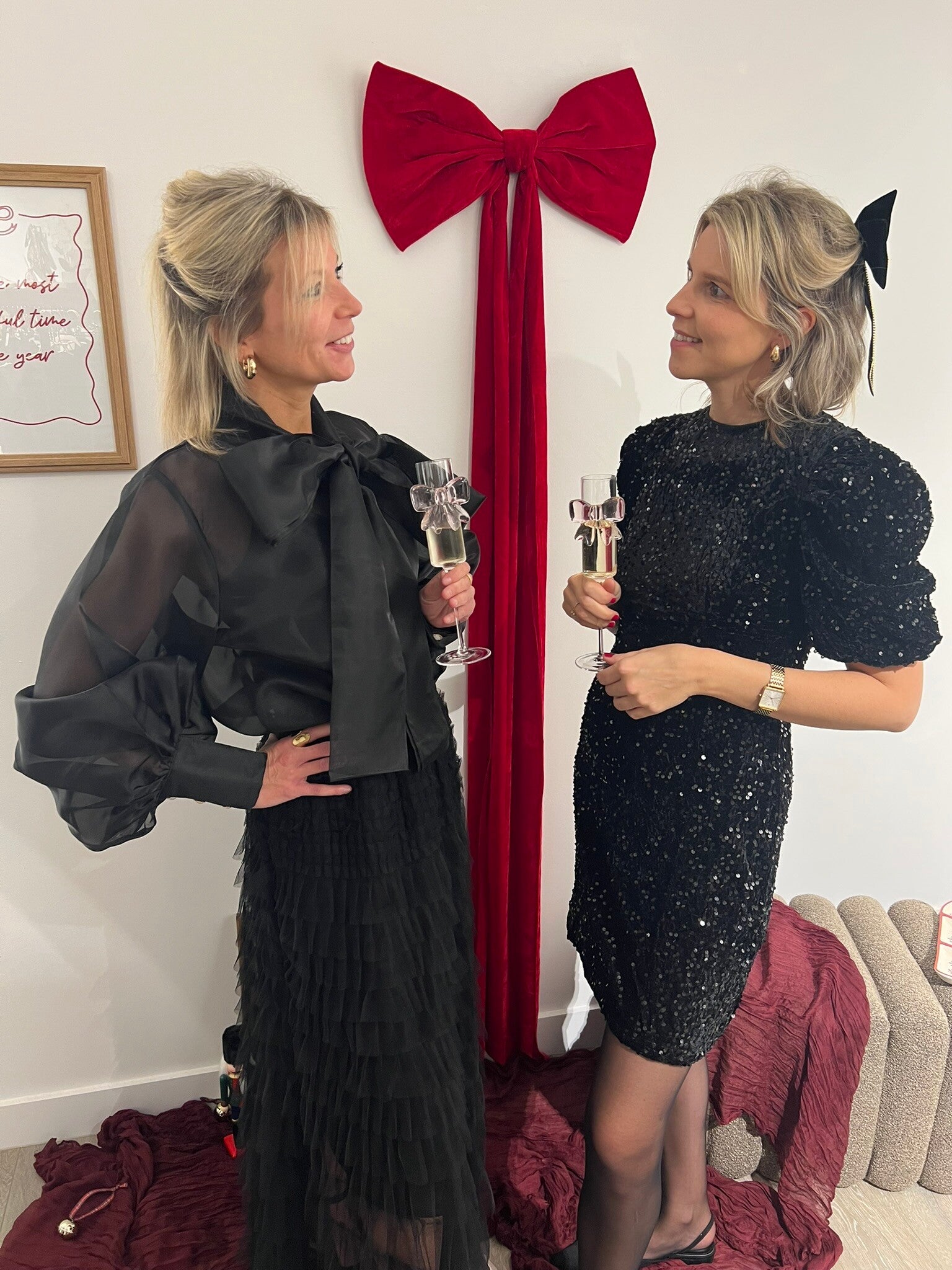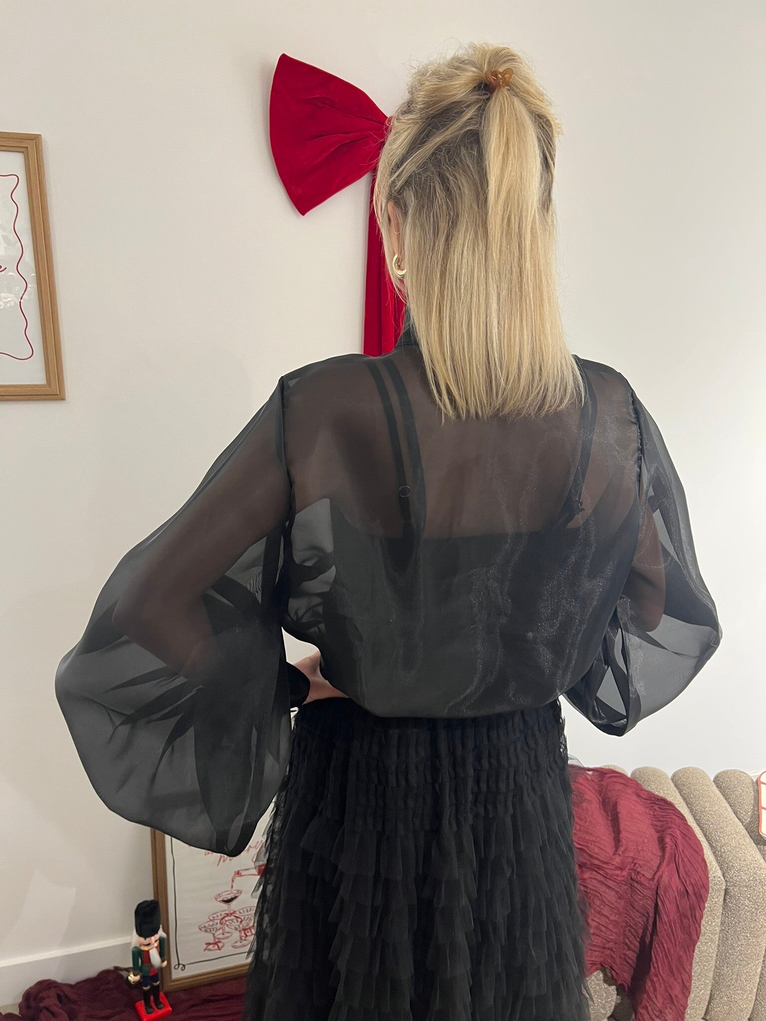 Prachtige zwarte blouse met strik aan de hals! De blouse heeft een topje met verstelbare lijstjes waardoor ze niet doorschijnt.