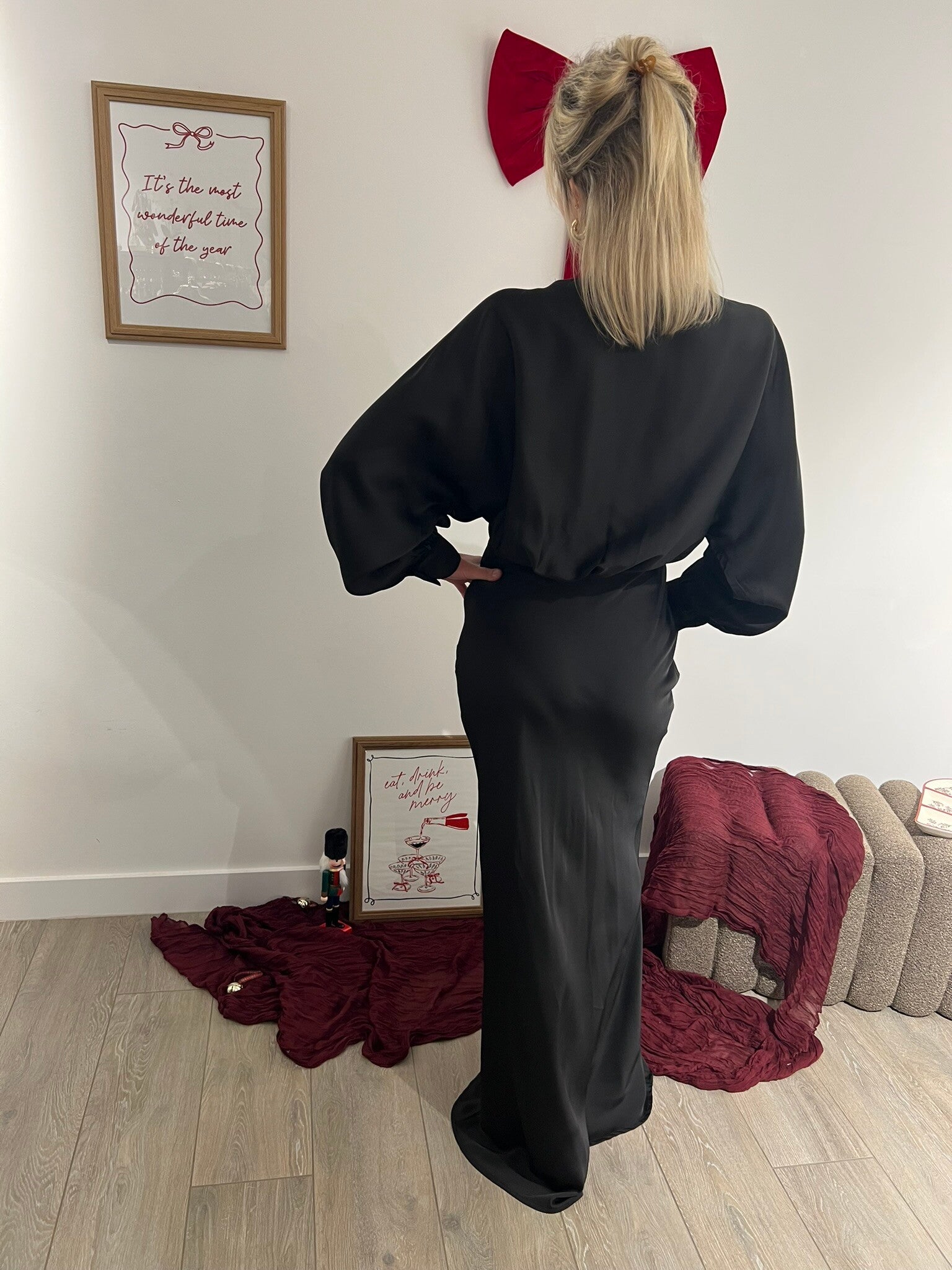 Prachtige satijnen zwarte jurk met lange mouwen & mooie décolleté.