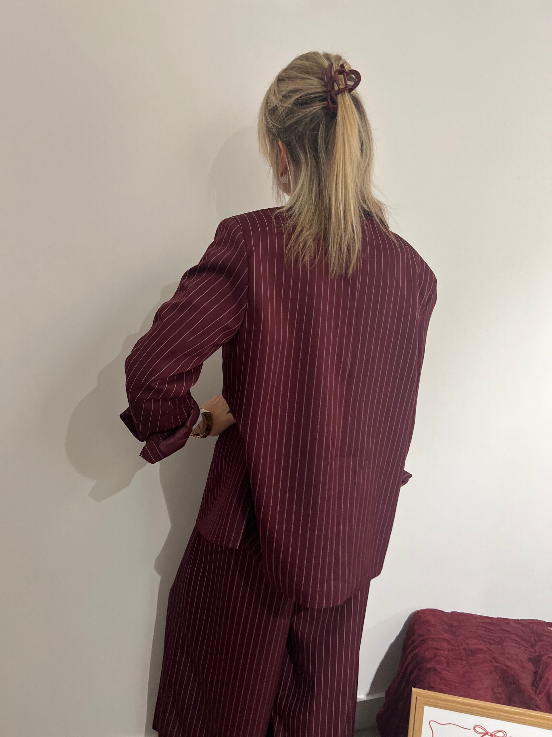 Prachtige burgundy blazer met knoopsluiting aan de zijkant & witte krijtstreep. De blazer kan zowel sportief met een jeans als gekleed op de bijpassende broek of rok worden gecombineerd.