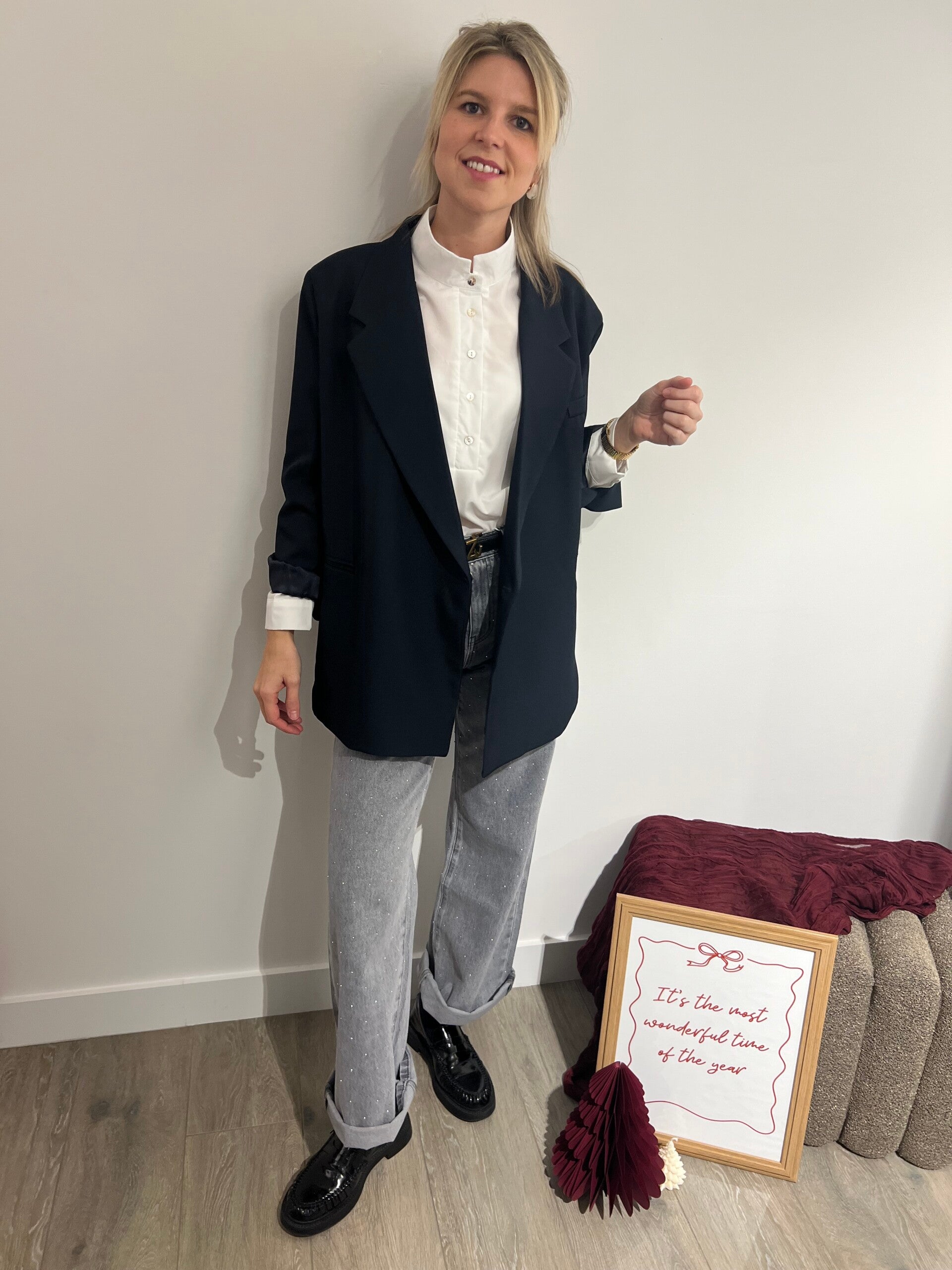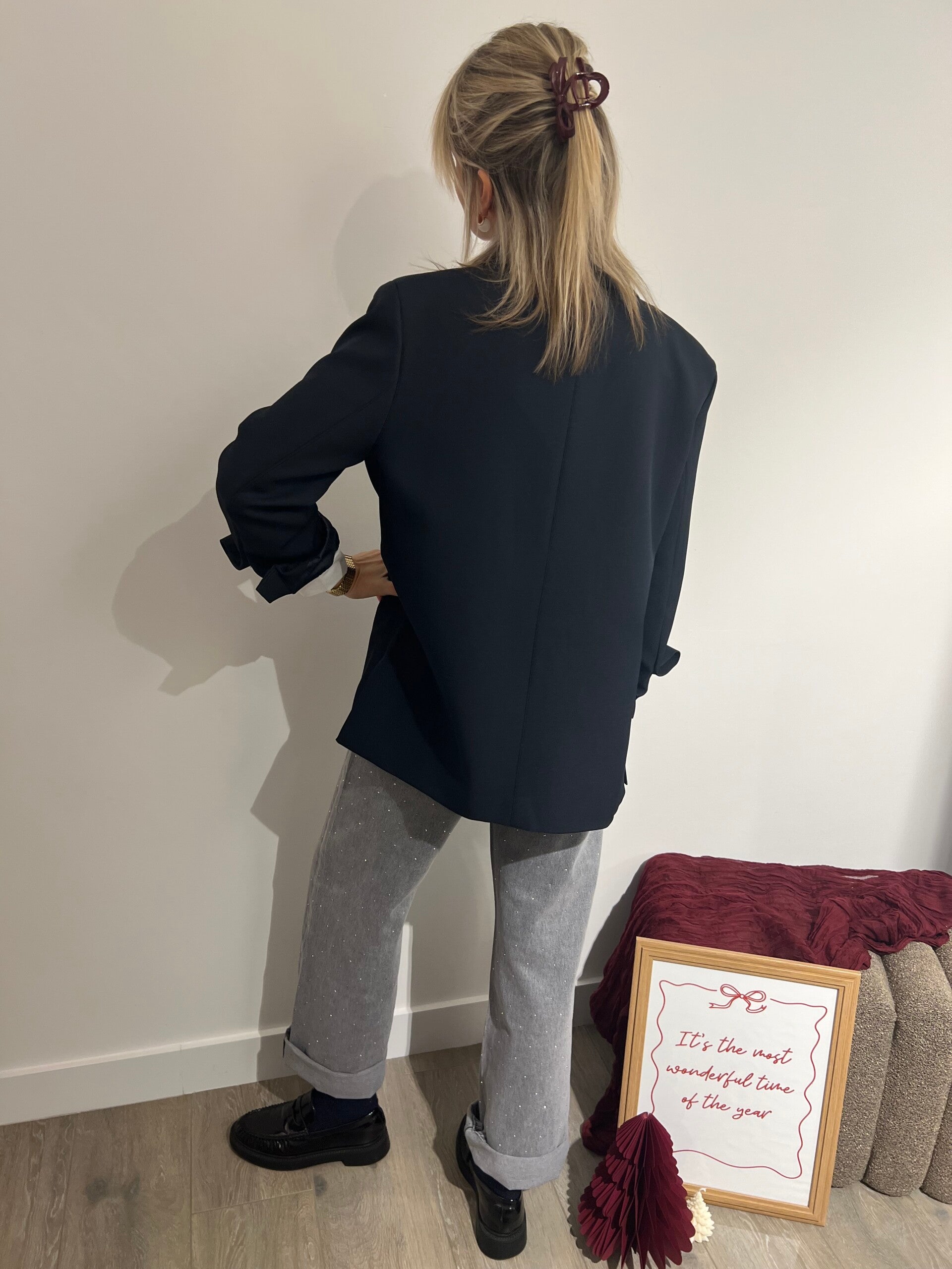 Prachtige grijze denim met strass! De denim heeft een high waist en een wide fit. De jeans kan zowel gekleed met een blouse en blazer als sportief met een pull en sneaker worden gedragen.