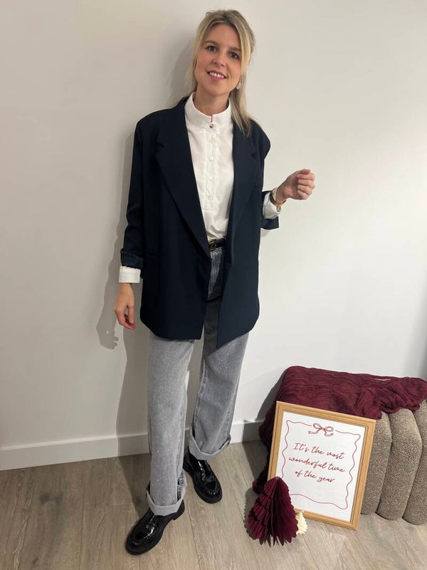 Prachtige navy blazer met knoopsluiting aan de zijkant. De blazer kan zowel sportief met een jeans als gekleed op een broek of rok worden gecombineerd.