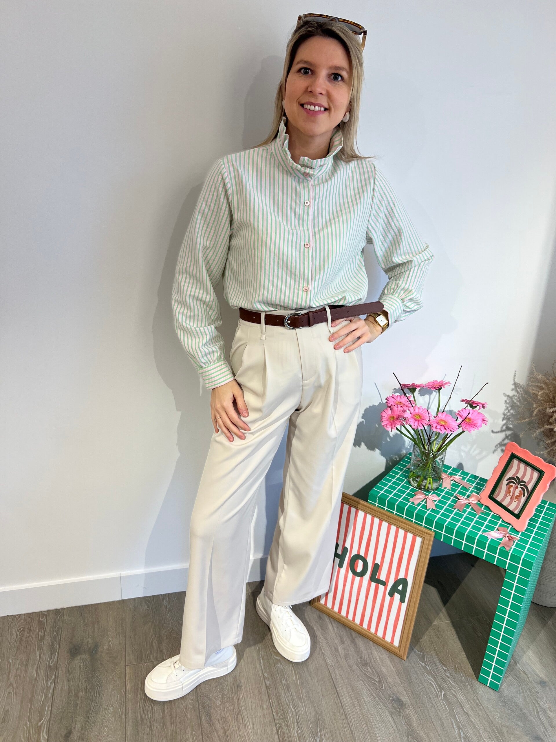 Supermooie blouse met opstaand kraagje en knoopsluiting. Verliefd op de combinatie van het mintgroen en het roze!