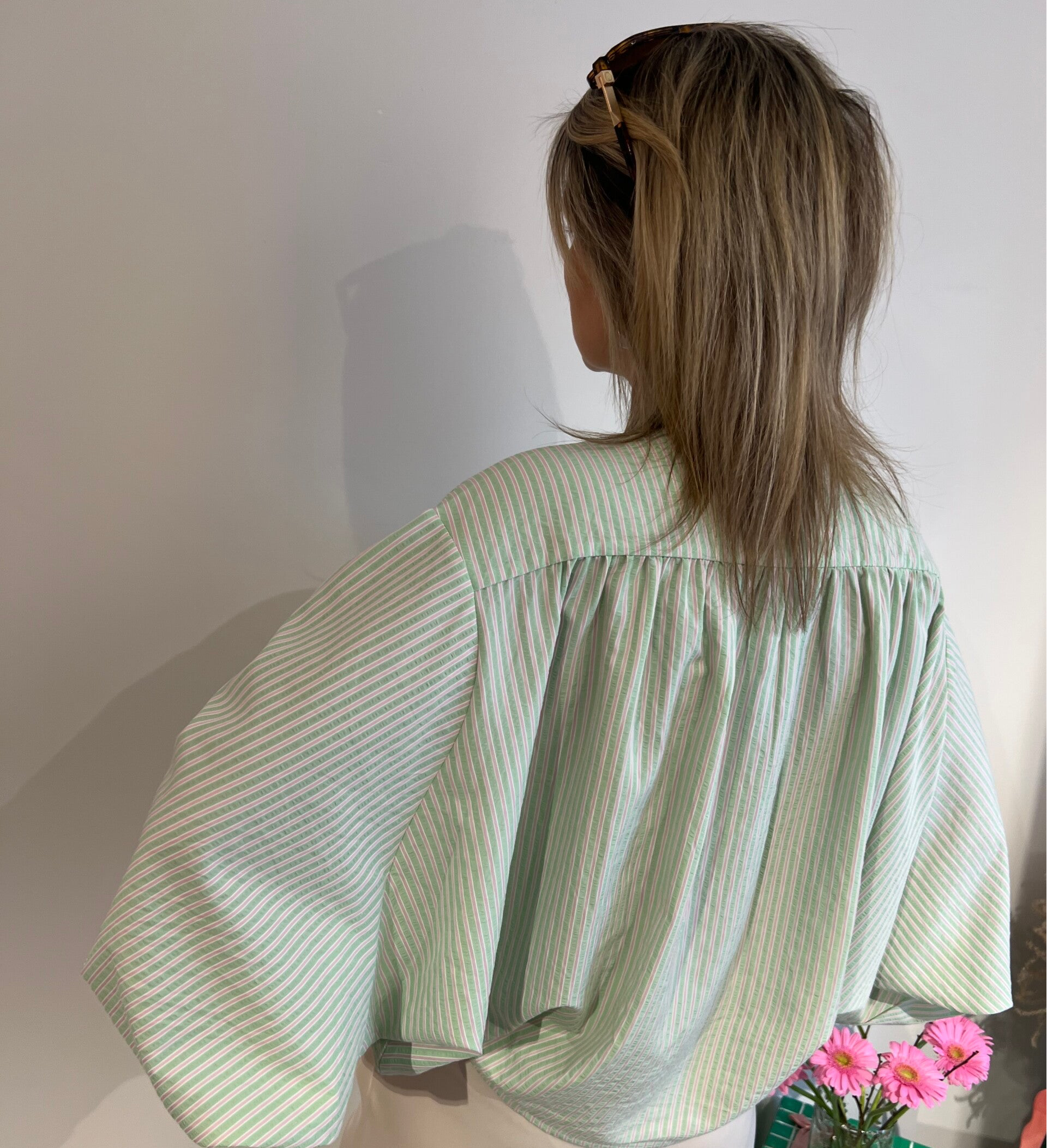 De blouse is beschikbaar in maat TU en past tot maat L. Julie draagt maat TU en meet 1m72.